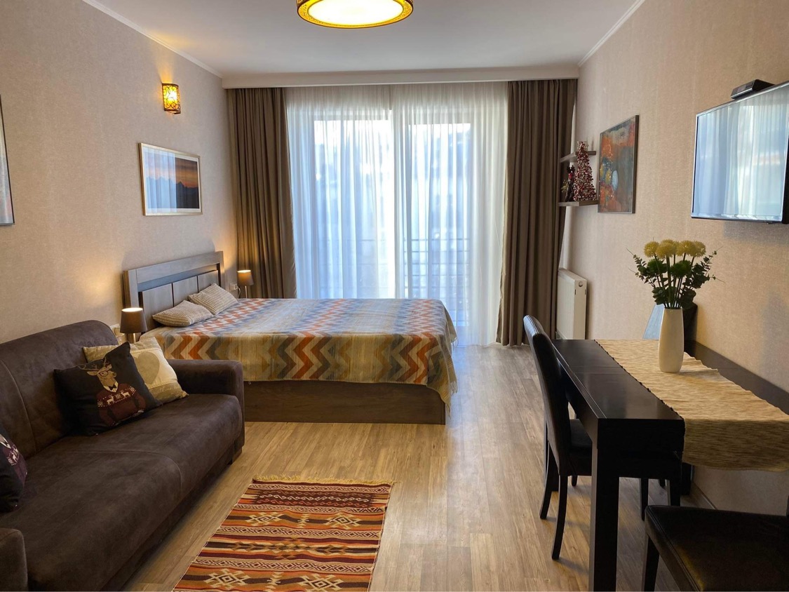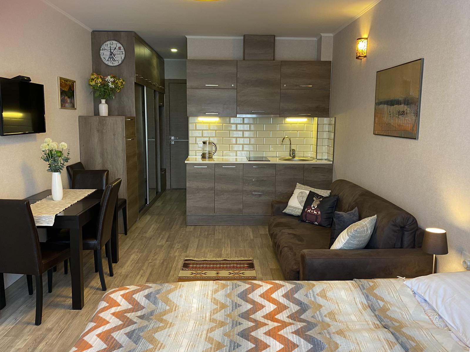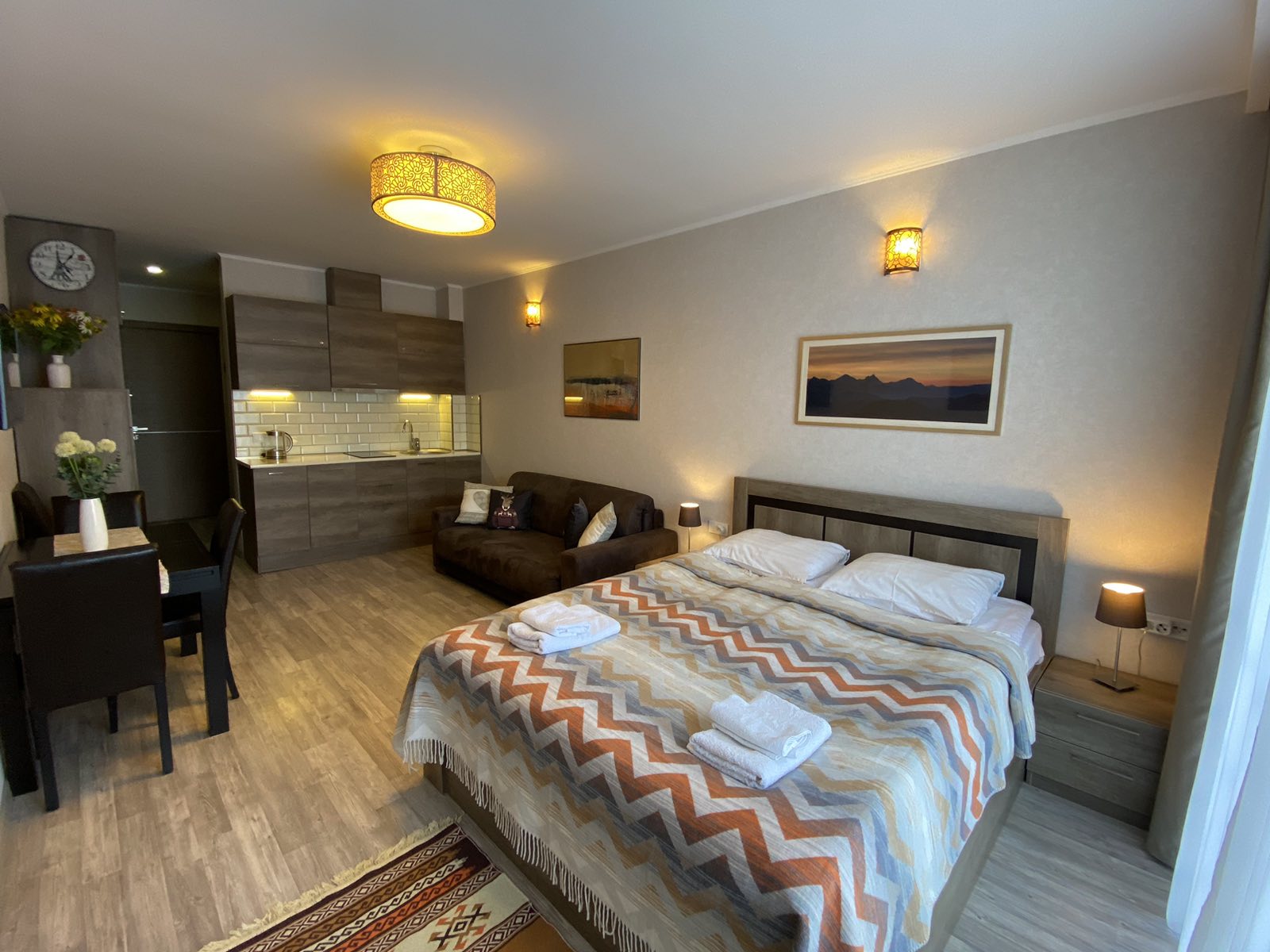 Equipment: A comfortable fully furnished studio type apartment of 30 m² has a balcony with stunning views of the mountains and courtyard. This apartment perfectly houses 4 people and is equipped with double bed (160x200) and a sofa-bed (160x200). It has a bathroom with a shower and a hairdryer, LCD TV, fully equipped kitchen (dishes, electric kettle, refrigerator, stove, and microwave oven), internet access - Wi-Fi. Bedding and towels are included.