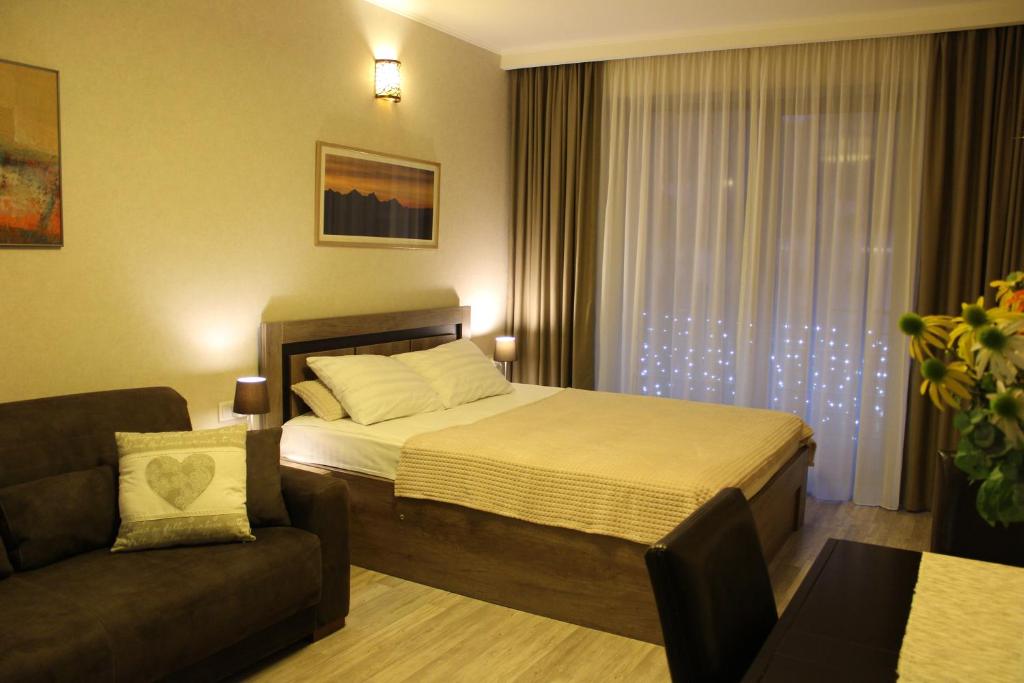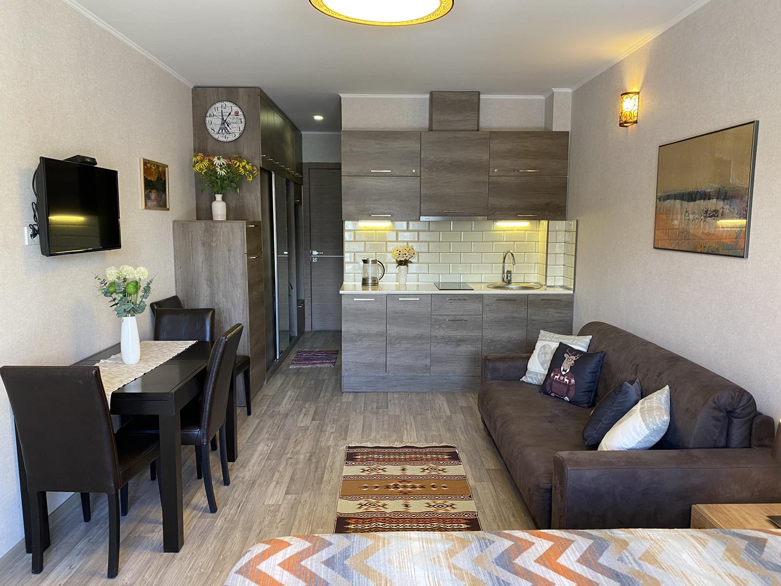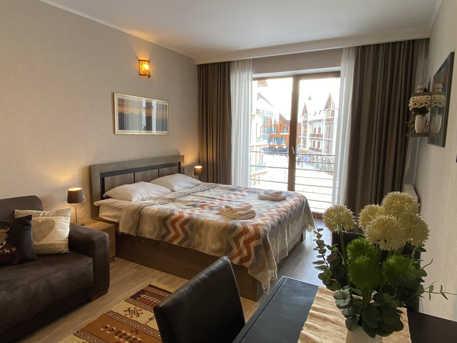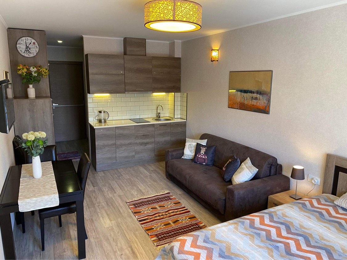 Equipment: A comfortable fully furnished studio type apartment of 30 m² has a balcony with stunning views of the mountains and courtyard. This apartment perfectly houses 4 people and is equipped with double bed (160x200) and a sofa-bed (160x200). It has a bathroom with a shower and a hairdryer, LCD TV, fully equipped kitchen (dishes, electric kettle, refrigerator, stove, and microwave oven), internet access - Wi-Fi. Bedding and towels are included.