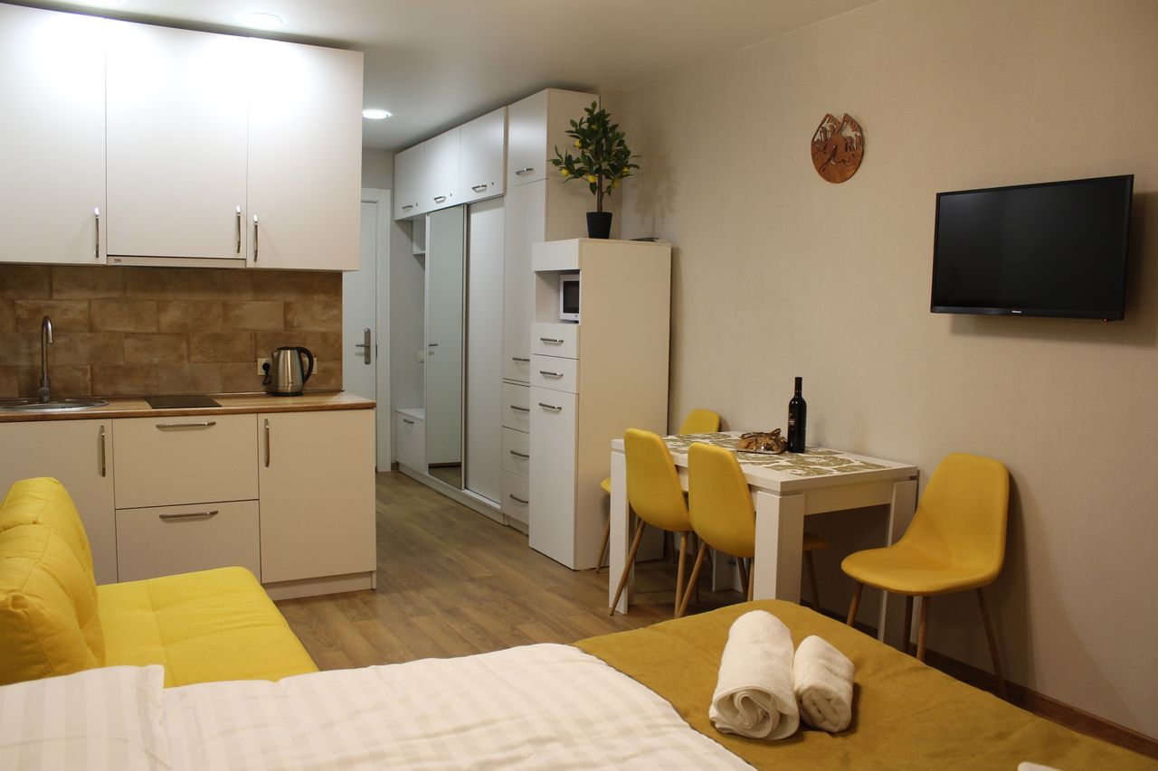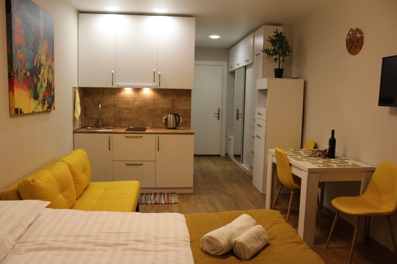 Оснащение: 1 комнатная, комфортабельная полностью мебeлированная квартира (площадь 30 кв.м), с балконам с которого открывается прекрасный вид на горы и на внутренный двор. Квартира рассчитана на 4 человека, двухспальная кровать (160х200) и раскладной диван. (150х200). Ванная комната в апартаментах оборудована душ-кабиной, имеется фен, стиральная машина, LCD телевизор, полностью оборудованная кухня (посуда, эл.чайник, холодильник, плита, микроволновая печь), интернет - Wi-Fi.