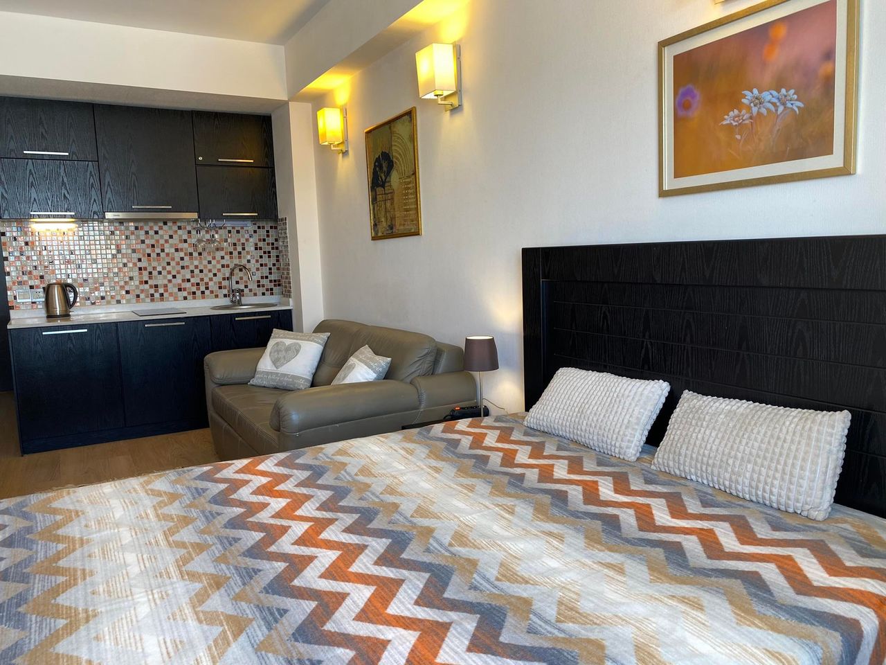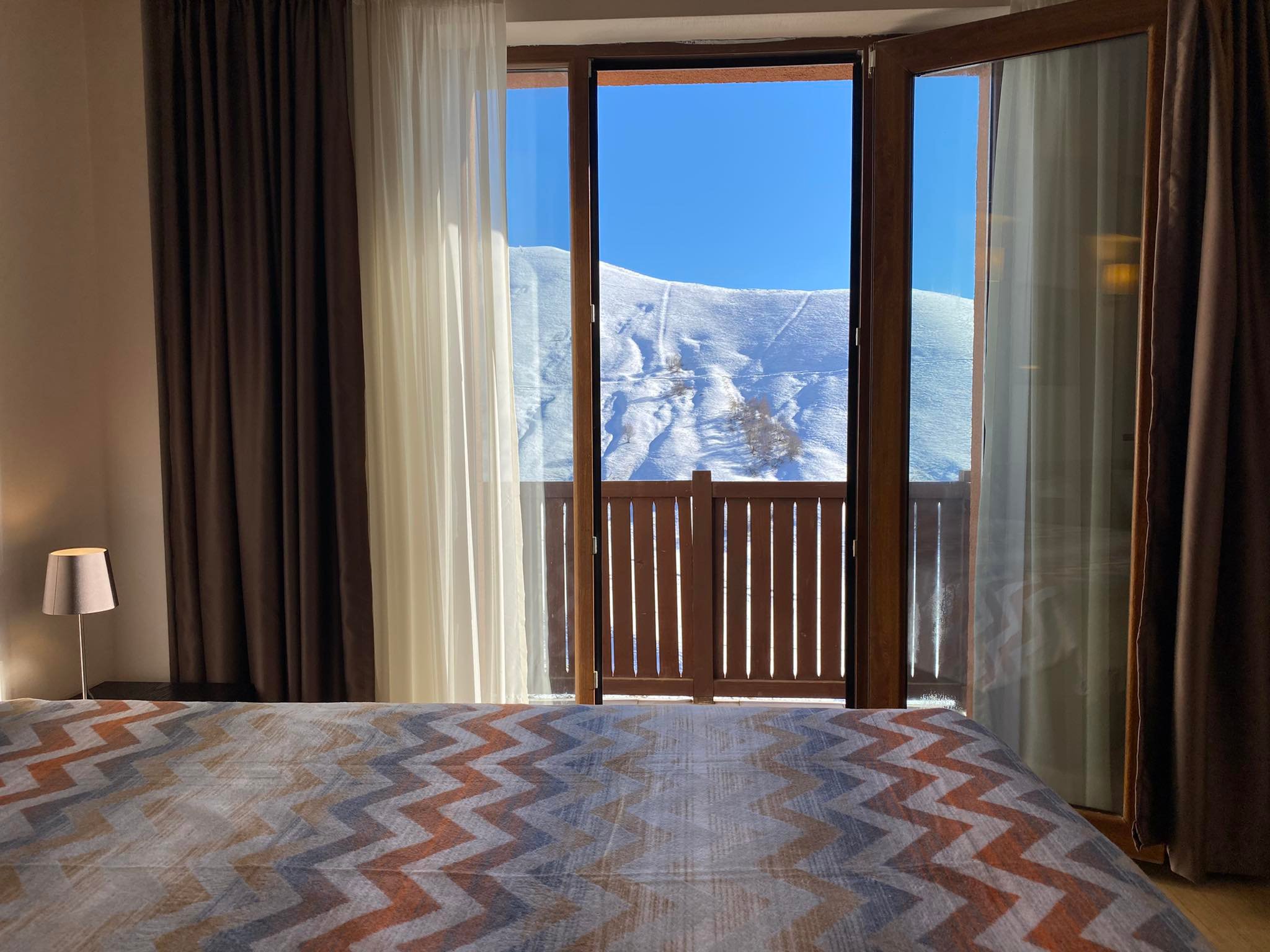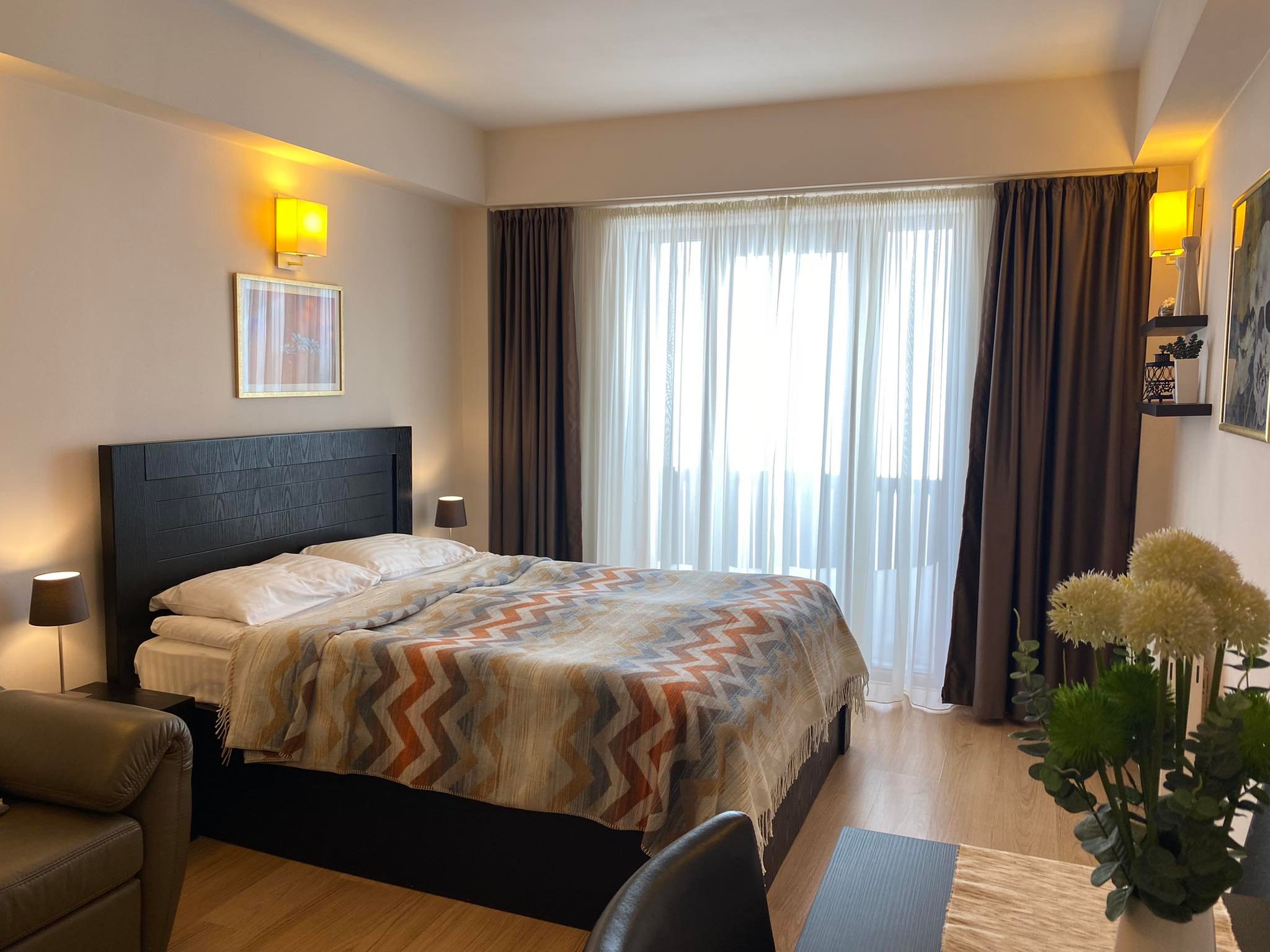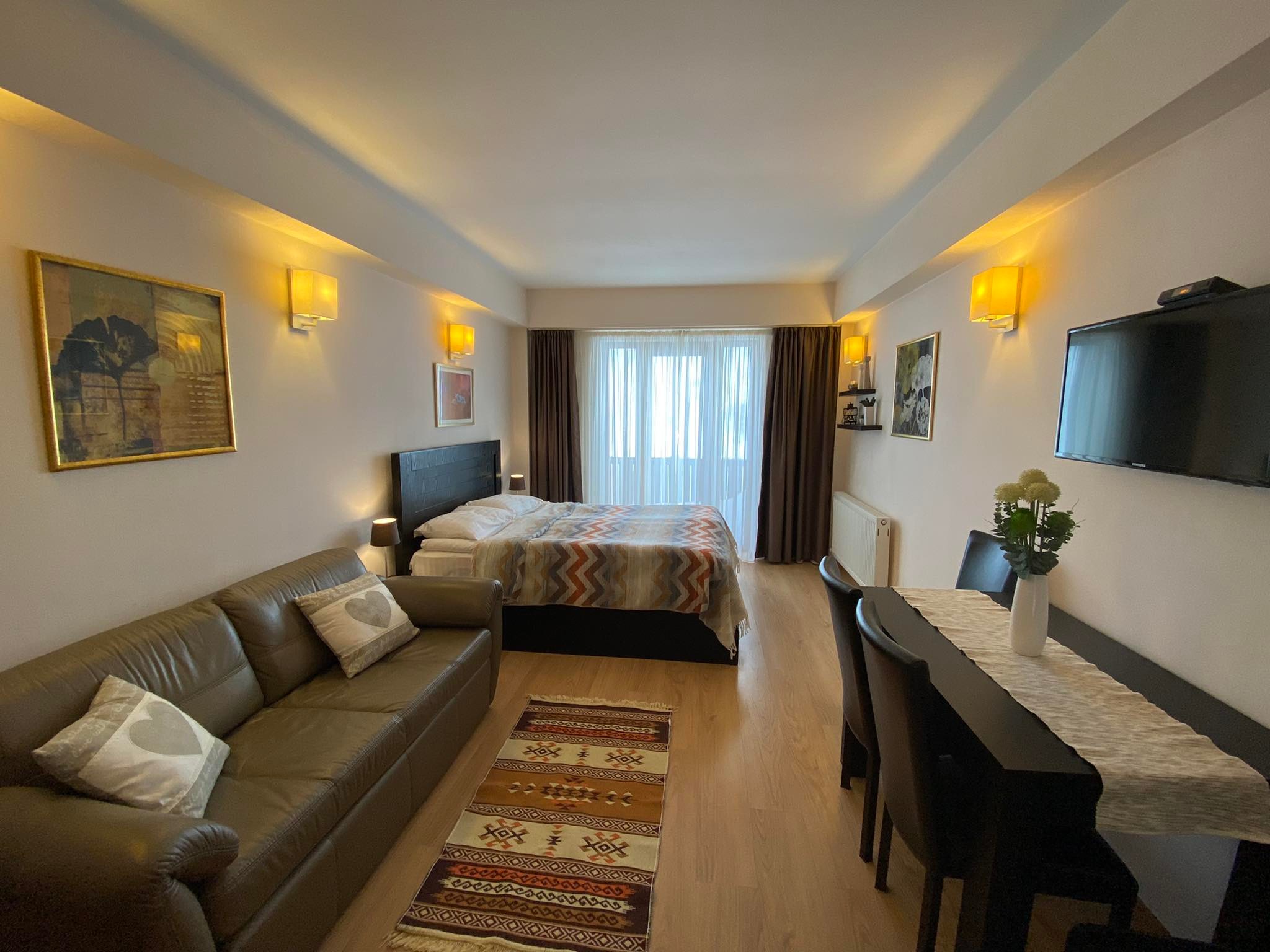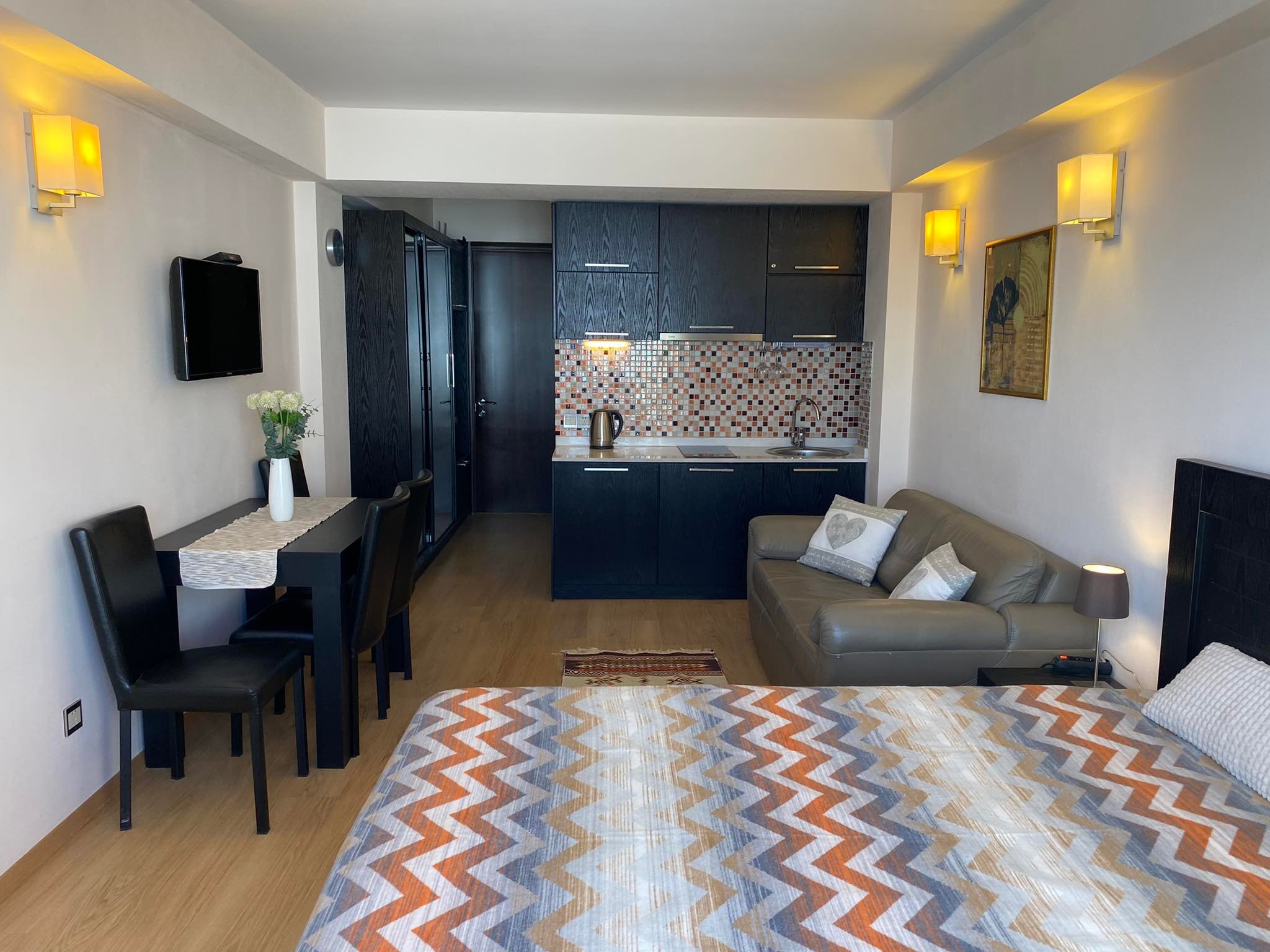 Equipment: A comfortable fully furnished studio type apartment of 30 m² has a balcony with stunning views of the mountains. This apartment perfectly houses 4 people and is equipped with double bed (160x200) and a sofa-bed (160x200). It has a bathroom with a shower and a hairdryer, LCD TV, fully equipped kitchen (dishes, electric kettle, refrigerator, stove, and microwave oven), internet access - Wi-Fi. Bedding and towels are included.