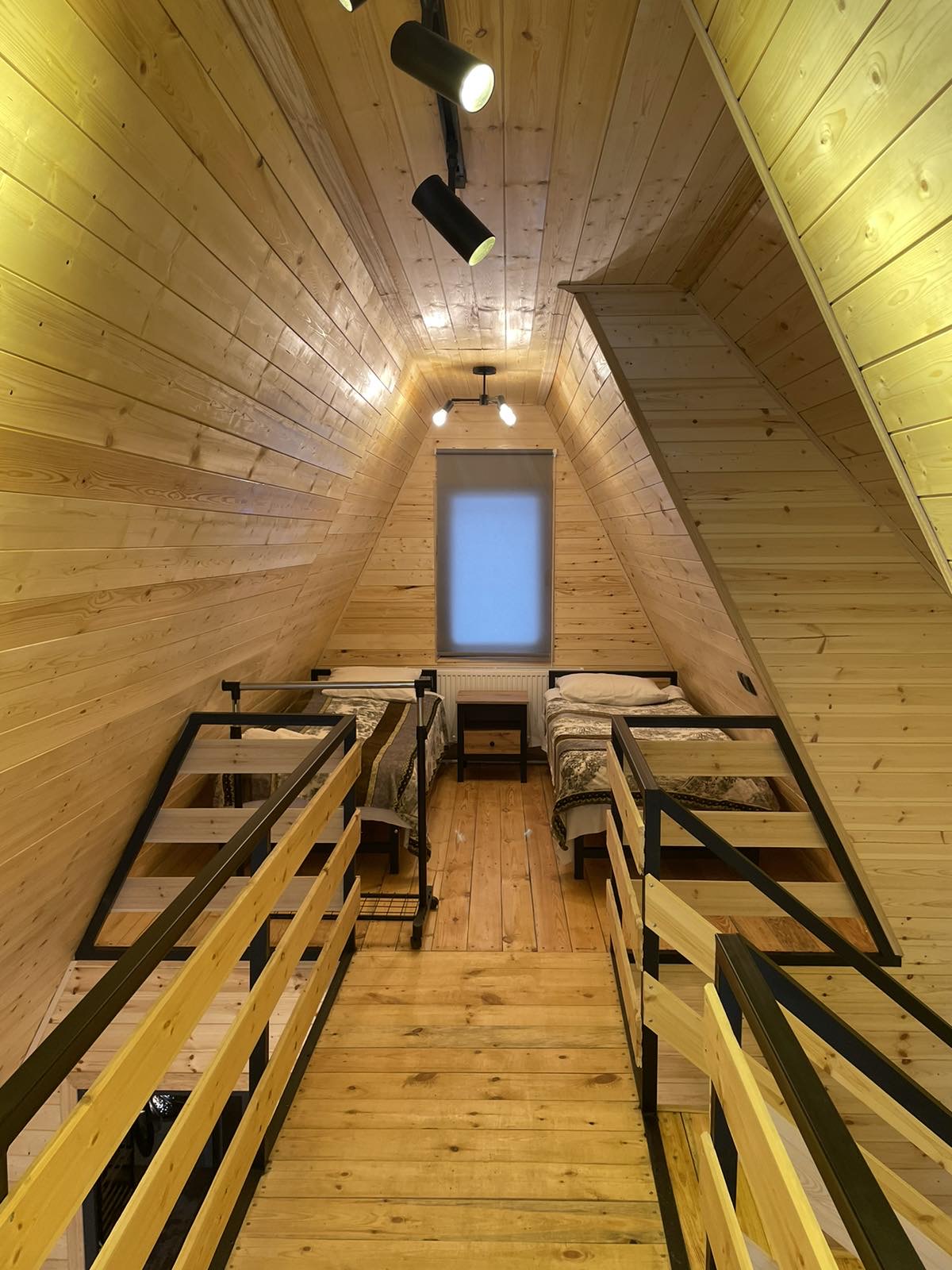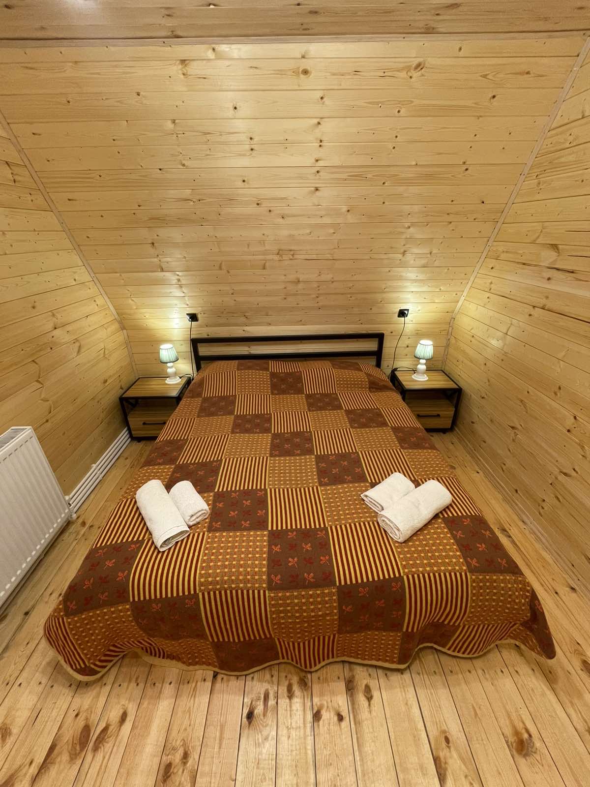В коттедже умешается 5-6 человек. На первом етаже одна двухместная кровать, на втором етаже две одноместные кравати, в зале стоит раскладнои диван, где может разместиться